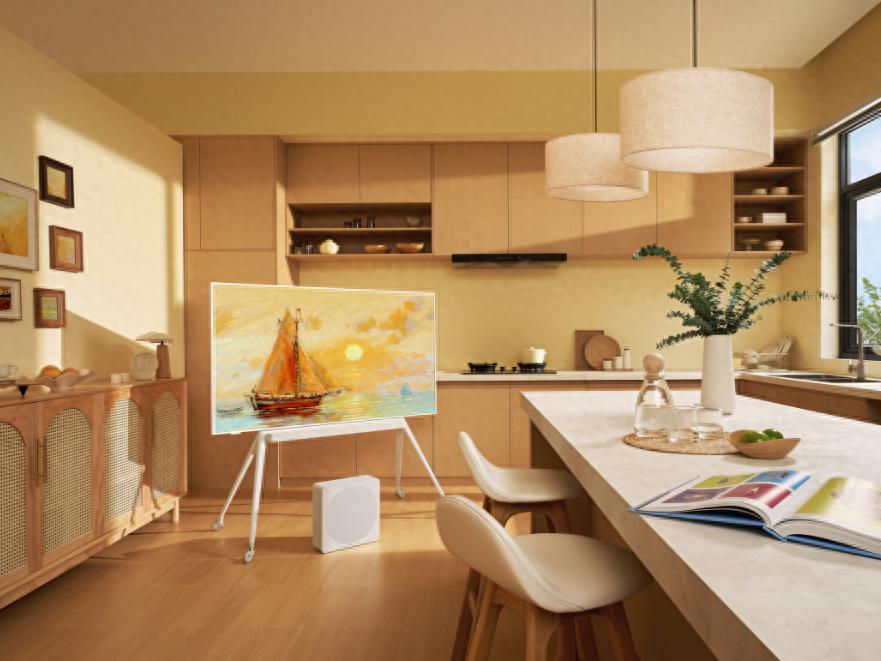 一體化設計的機身厚度只有27.9mm,既沒有額外突出部分又沒有暴露在外的線纜,能夠真的像一幅畫一樣貼在牆壁上,對現在很多號稱超薄但實際佔地面積很大的藝術電視,那就是降維打擊。它還有薄荷青、暮夜榆和晨曦木三種顏色的磁吸式畫框,跟各種家裝風格都很搭。推門回家看到它,確實是能讓人一下子心情愉悅起來。