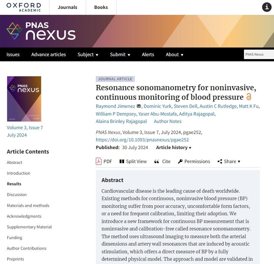 Resonance sonomanometry for noninvasive, continuous monitoring of blood pressure, PNAS Nexus, Volume 3, Issue 7, July 2024, page 252, https://doi.org/10.1093/pnasnexus/pgae252
