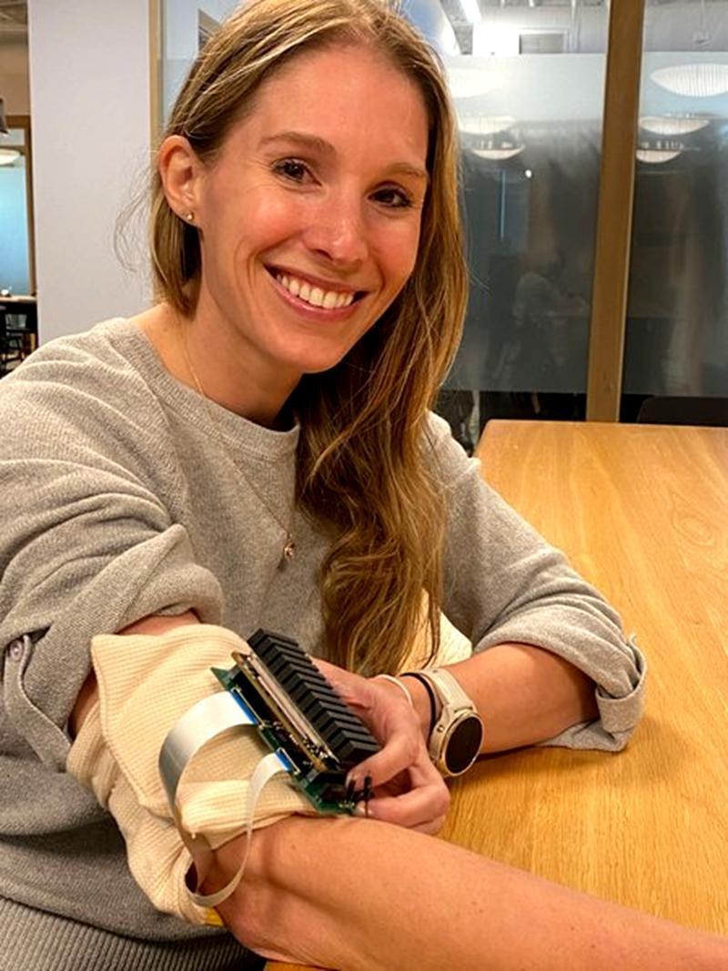 Esperto比撲克牌還小,可以通過臂帶佩戴在手臂上,包含聲波發射和超聲成像部件,可以自動定位血管進行測量,患者只會在皮膚上感覺到輕微的嗡嗡聲,不像現在的血壓計,可能會因爲加壓而導致一定的不適。
