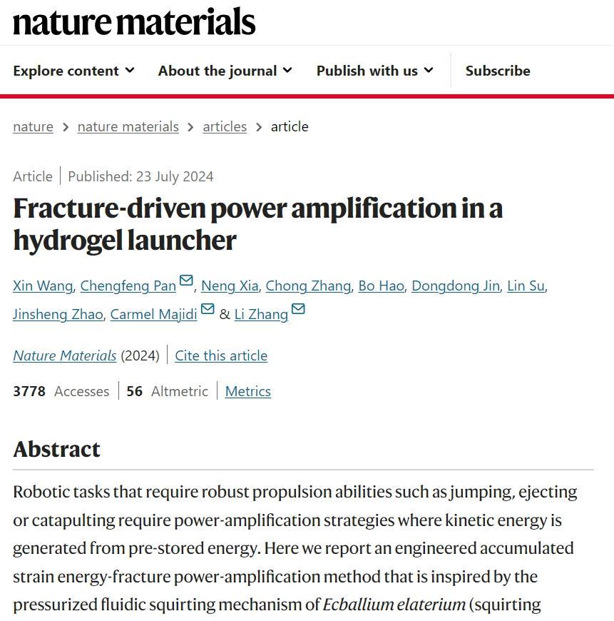 Wang, X., Pan, C., Xia, N. et al. Fracture-driven power amplification in a hydrogel launcher. Nat. Mater. (2024). DOI:10.1038/s41563-024-01955-4