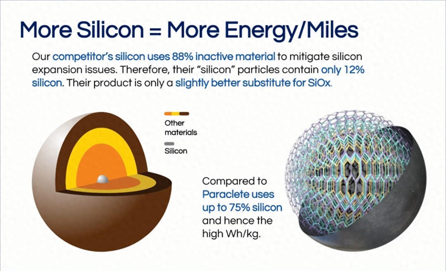 Paraclete位於密歇根州,我找到該公司網站,但沒有多少這種材料的具體信息,只是聲稱這種材料是當今市場上容量最高、循環穩定性良好、已經過商業驗證的硅負極材料,尤其是在長循環期間庫倫效率幾乎達到100%,也就是說幾乎不會衰減。另外在阿貢國家實驗室的測試中,這種材料可以達到8C的驚人超快充速度。