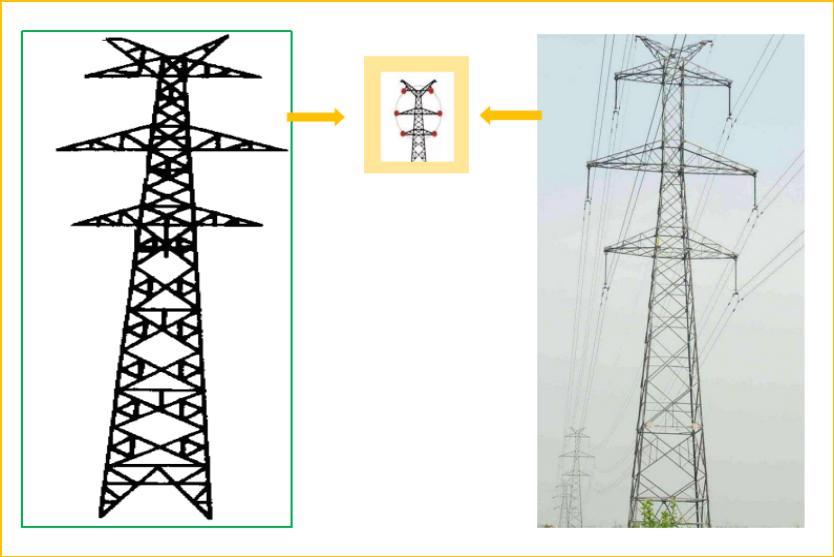 在中近距離的場景下,220kV及以上電壓等級的輸電塔一般爲幹字型,塔頭類似“幹”字。