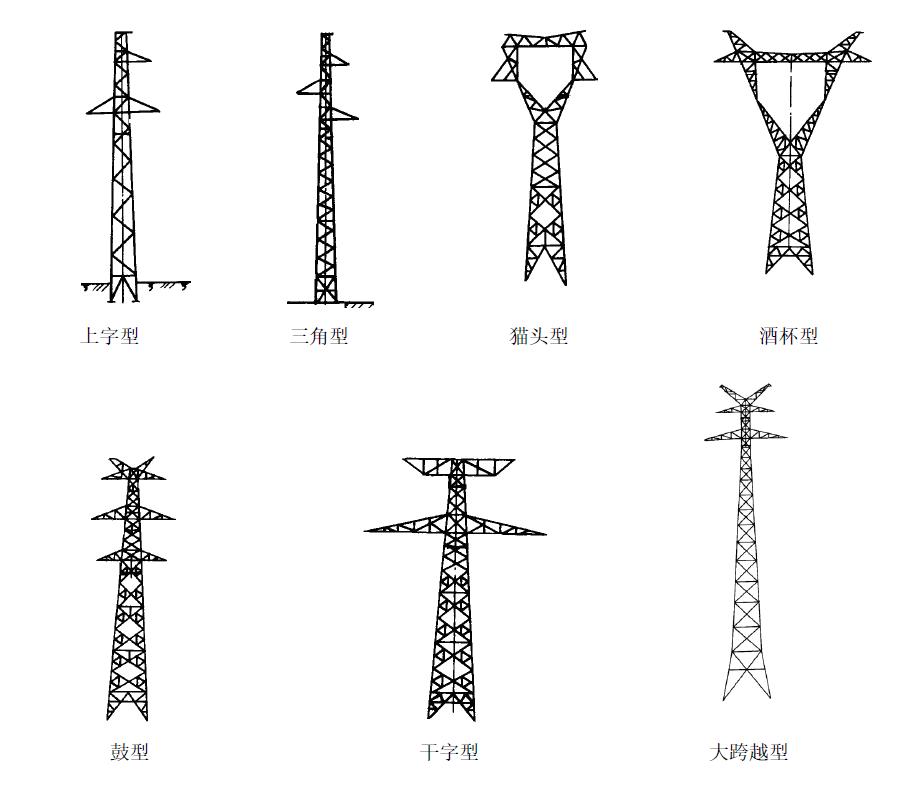 輸電塔的形狀多種多樣,可分爲上字型、三角型、幹字型、貓頭型、酒杯型、鼓型、羊角型、V字型、門型等多種類型。各個形狀的輸電線有着對應的功能和應用場景。