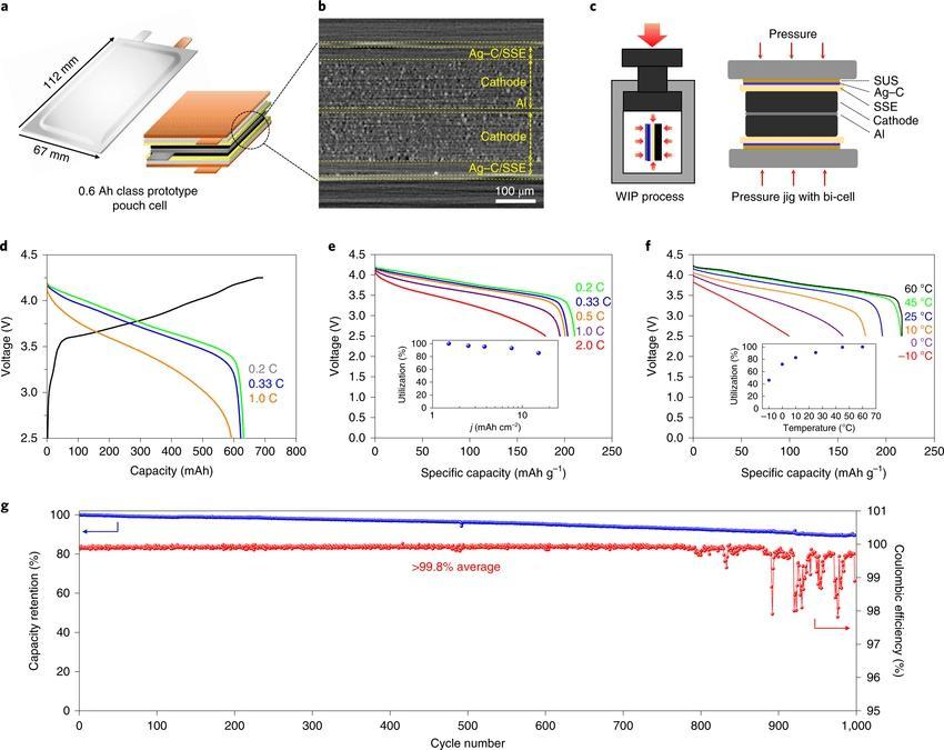 爲什麼三星的固態電池,具有如此強悍的性能?我找到了三星2020年3月,發表在《自然-能源》上的一篇論文,原來它的關鍵,是採用了銀碳複合負極,及硫化物電解質,並利用了一種熱等靜壓技術,來改善電極和電解質之間的接觸,從而獲得了高能量密度,穩定的庫侖效率和長循環壽命。