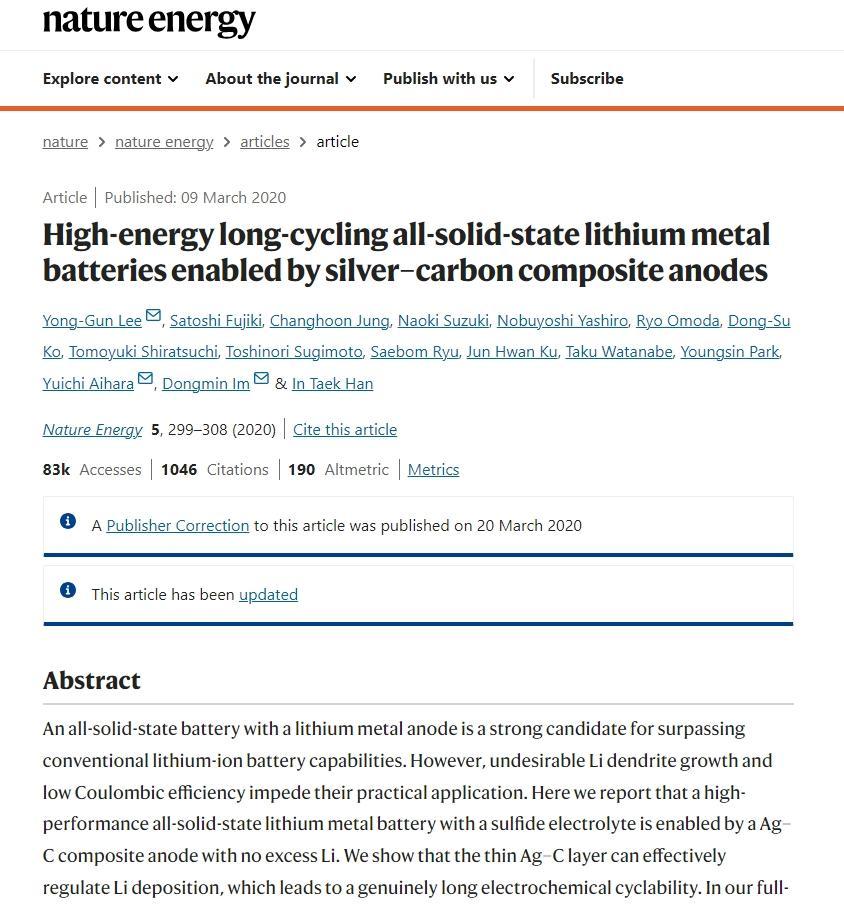 Lee, YG., Fujiki, S., Jung, C. et al. High-energy long-cycling all-solid-state lithium metal batteries enabled by silver–carbon composite anodes. Nat Energy 5, 299–308 (2020). doi:10.1038/s41560-020-0575-z