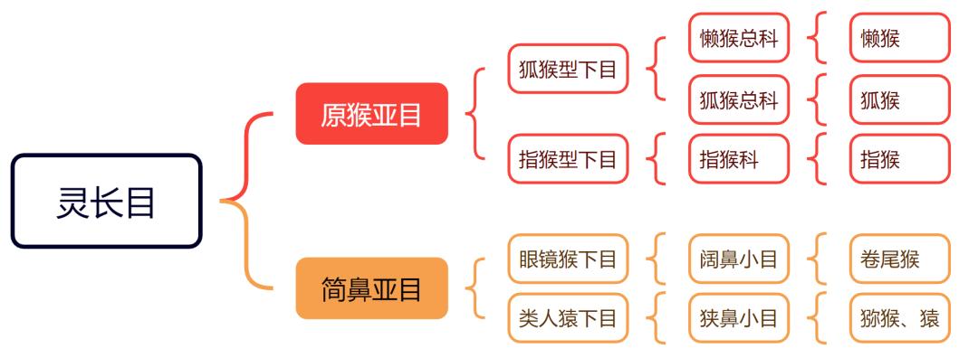 大部分靈長類屬於簡鼻亞目,相比於原猴亞目,它們的鼻子非常短,這導致鼻子乾燥,面部也趨於平坦。在簡鼻亞目中,除了眼鏡猴下目這一特殊羣類,剩下的和我們人類很接近,所以叫類人猿下目,人類在分類學上也屬於這一下目。