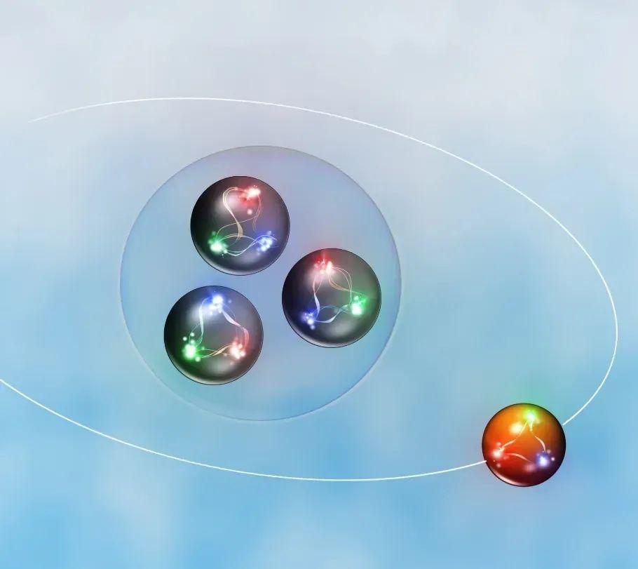 (反)超核的藝術效果圖。中間是三個(反)質子/中子,外部是一個(反)超子(圖片來源:RIKEN)