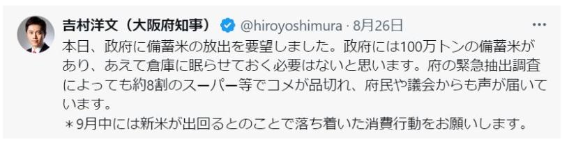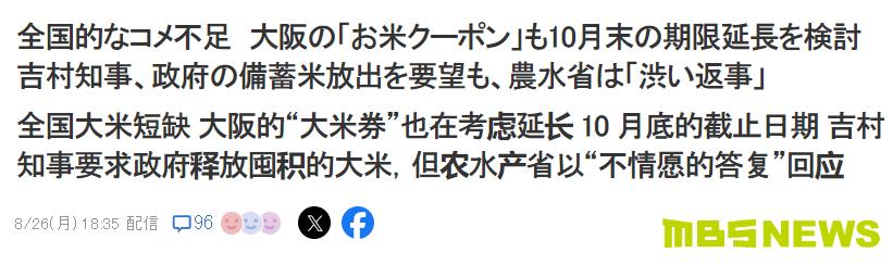 然後就是日本大阪府知事說,根據該縣緊急抽樣調查,約80%的超市沒有大米。希望政府趕緊放出戰備糧。