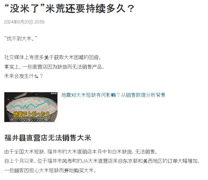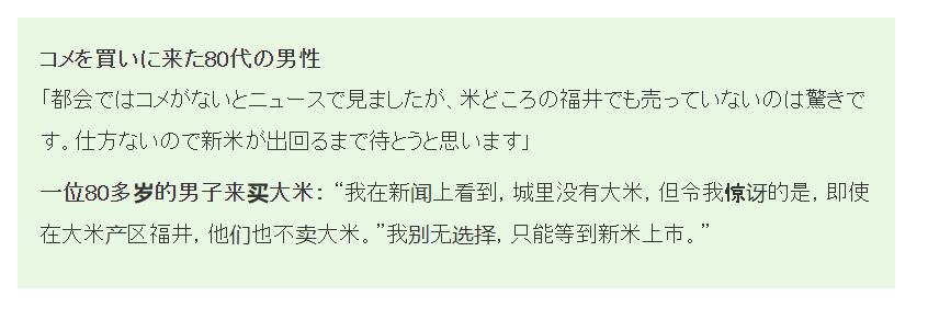 日本NHK電視臺報道了,日本福井縣等地區出現米荒,以及老百姓瘋搶大米的情況,就有老百姓在接受NHK採訪時表示,大米產區福井,他們也不賣大米,我別無選擇,只能等到新米上市。