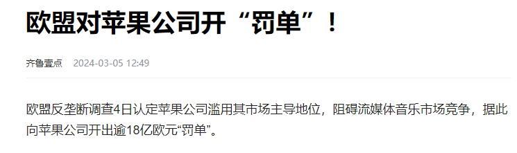 確實是,爲啥這麼說呢,因爲人家國外,早就對“蘋果稅”下手了。歐洲流媒體巨頭Spotify,不滿30%蘋果稅,更不滿蘋果還自己下場做音樂,這相當於百米賽跑,蘋果先跑了30米,你咋辦?後來歐盟呢,就以壟斷爲由,給蘋果開了141億人民幣的罰款。