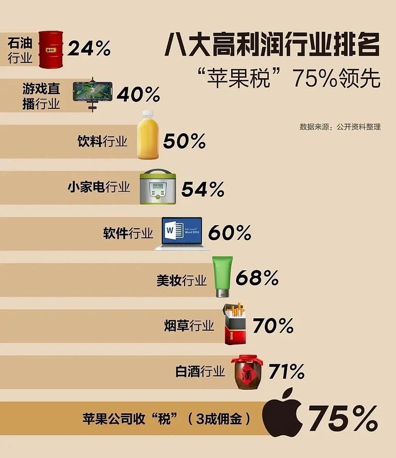 “蘋果稅”已經成了蘋果利潤的重要貢獻者,而蘋果對中國收的“蘋果稅”全世界最高,標準企業蘋果稅30%,小型企業15%,而美國是27%和12%,歐盟17%和10%,韓國26%和11%,都低於中國,不僅如此,蘋果不允許中國企業APP外交易,或者第三方支付,但是在歐盟、美國和韓國卻是允許的,咋回事,看中國好欺負是嗎?