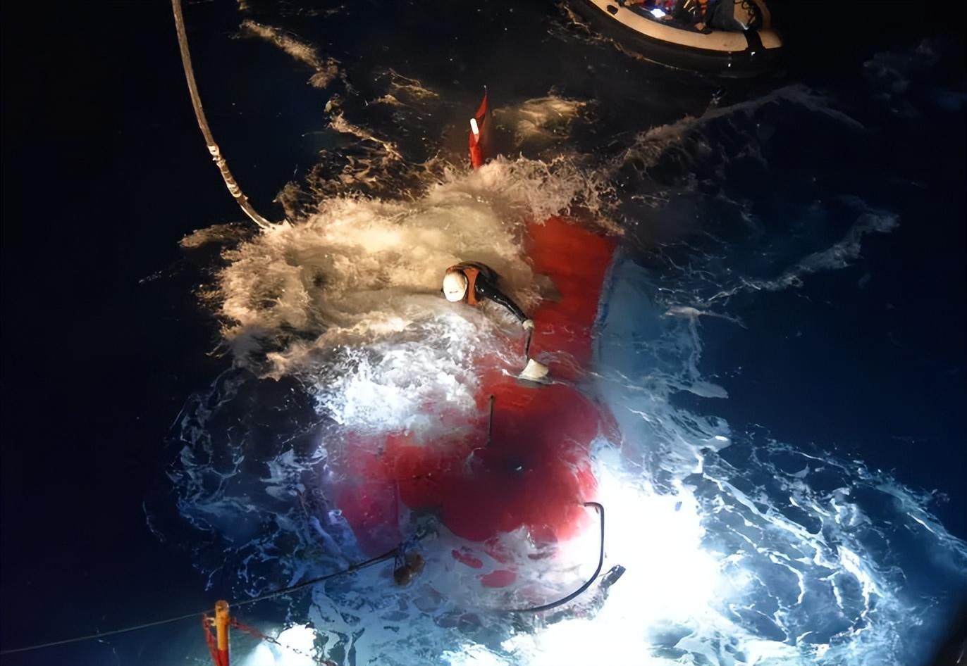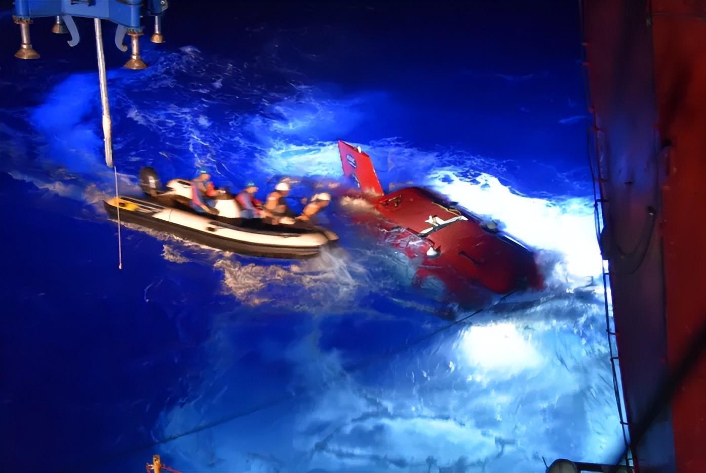 “蛙人”落水也是常有的事。如果發生,“蛙人”要遊向小艇,或等待小艇開過來爬上小艇,再跳到潛水器繼續作業。有時,在作業中被海浪淹沒的“蛙人”要在水下憋氣長達幾十秒,倘若實在支撐不住了,只能鬆手浮出水面,再重回小艇。如果此時你站在甲板上,一定會爲他們捏一把汗。