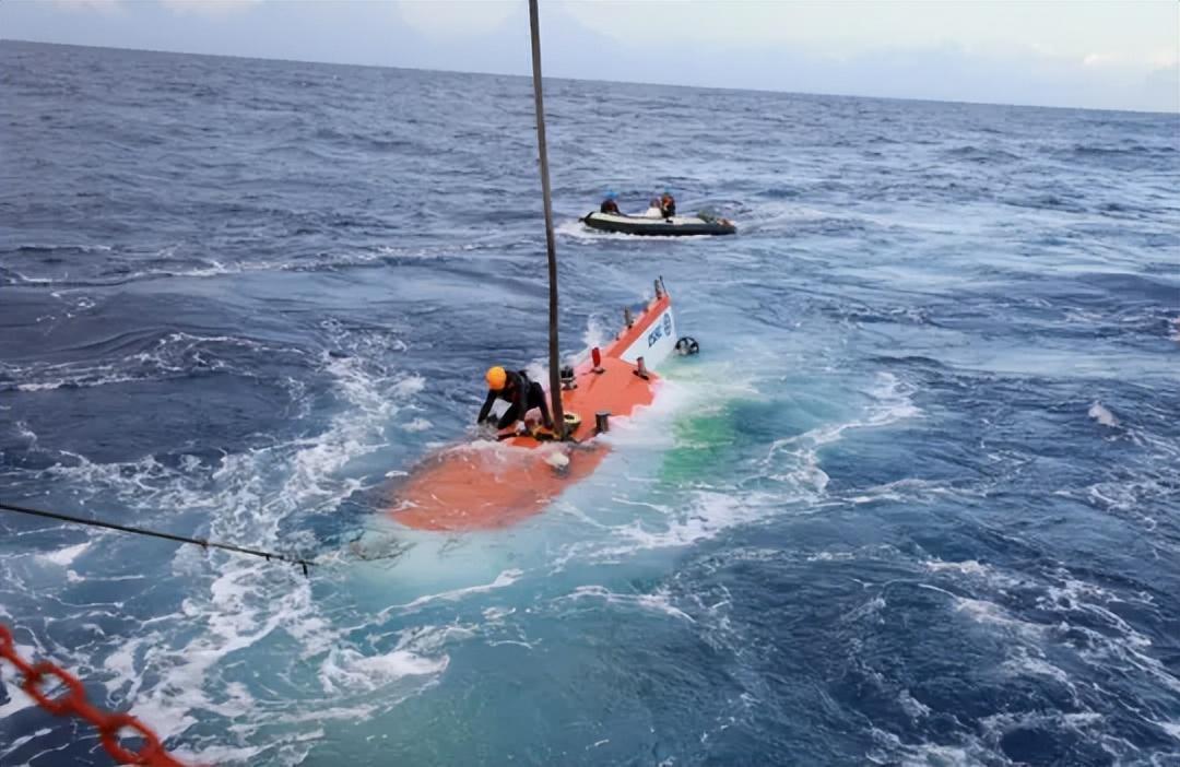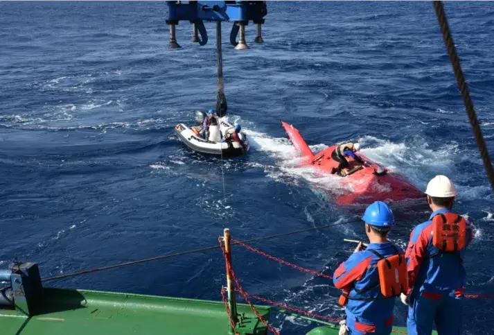開船人員和船尾指揮人員的配合:爲了防止潛器被湧浪推向科考船發生碰撞,船需要以約1節的速度往前開,螺旋槳的排出流正好給潛器一個遠離科考船的力;如果船速過快,潛器在拖曳下可能會首部扎進水裏,潛器上的“蛙人”也隨之沒於水面下,因此,科考船要保持穩定的排出流;另外,潛器與船的艏向也需要儘量保持一致;