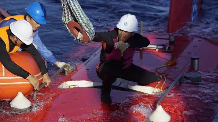 “蛙人”的工作看似簡單,但實際上充滿挑戰。海面上湧浪的大小主要決定了操作的難度係數。“深海勇士”號和“奮鬥者”號的布放回收條件分別是4級和5級海況(4級海況浪高1.25~2.5m,5級海況浪高2.5~4.0m)。如果天氣良好,風平浪靜,“蛙人”的工作相對容易。但如果海況惡劣,風浪較大,小艇和潛水器在海面劇烈搖晃,潛水器有時沒於水面之下,橫搖達到50~60度,2022年,“深海勇士”有次橫搖甚至達到77度。因此,“蛙人”必須有較強的身體和心理素質,眼疾手快,在與風浪的搏擊中掛纜或解纜。
