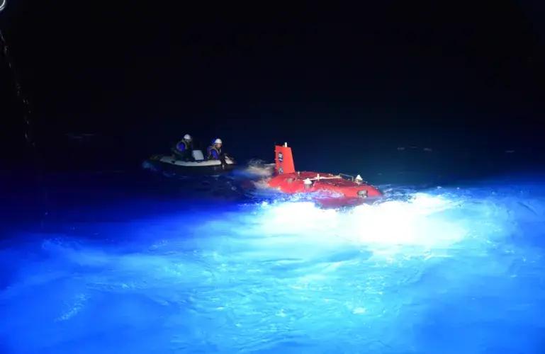當有夜潛任務的時候,科考船甲板上的燈光加上潛水器還在水面下的燈光將海水照得透亮,“蛙人”的作業像是一場搏擊風浪的舞臺劇,頗爲震撼,也頗具美感。燈光吸引了衆多海洋趨光生物,常有飛魚騰空飛起助演,甚至有些飛魚會降落到小艇裏,給嚴肅的任務帶來一些趣味感。