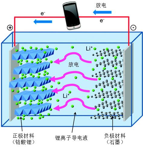 鋰離子從負極(石墨)轉移到正極(鈷酸鋰)對外提供電流(圖片來源:Erb Institute 作者漢化)