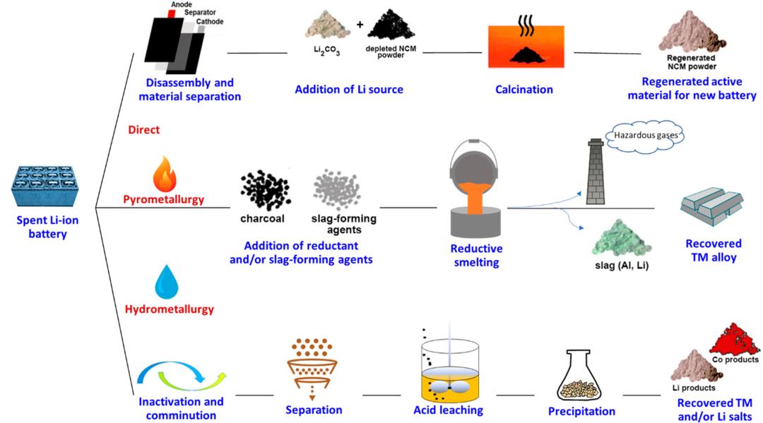 廢舊鋰離子電池的直接再生策略(上)、 火法冶金(中)和溼法冶金(下)回收方法 (圖片來源:參考文獻[3])