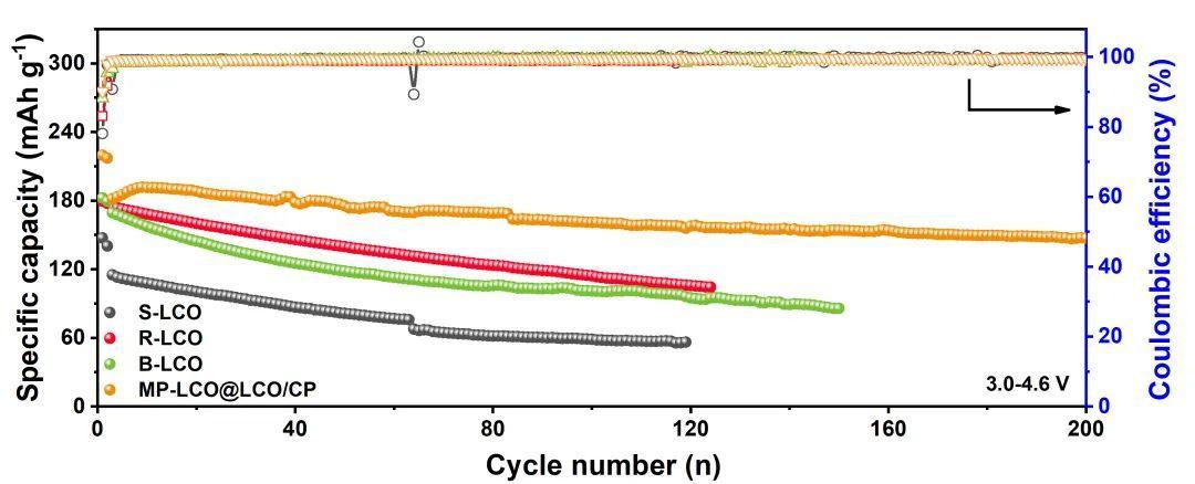 經過這一系列的操作,升級後的鈷酸鋰在4.6V電壓下展現出了優異的電化學性能。它的初始放電容量達到了218.8mAhg−1,在0.5C下循環200圈後的容量保持率仍然高達80.9%,意味着它不僅可以提供較多的電能,而且具有較長的循環壽命。