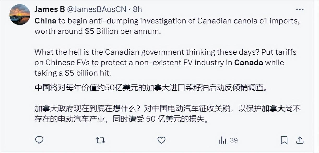 中國的反制,加拿大恐怕承受不起,加拿大前腳剛宣佈要對中國電動汽車徵收100%的關稅,對中國鋼鐵和鋁徵收25%的關稅,中國馬上就公佈了反制措施,對加拿大的菜籽油、相關化工產品發起反傾銷調查。