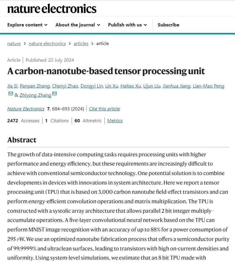 中國碳基AI芯片取得重大突破!北京大學等多家機構組成的團隊,近日開發出一種全新類型的、全球第一款碳納米管TPU芯片,能效極高,功耗極低,超谷歌AI加速器TPU1700倍,更不用說英偉達的GPU了,或成爲解決全球AI能耗瓶頸的關鍵。而最關鍵的是,這項重大突破不僅僅是技術上的,更可能預示着一個碳基AI時代即將來臨。這項研究已發表在7月22日《自然-電子學》雜誌上。