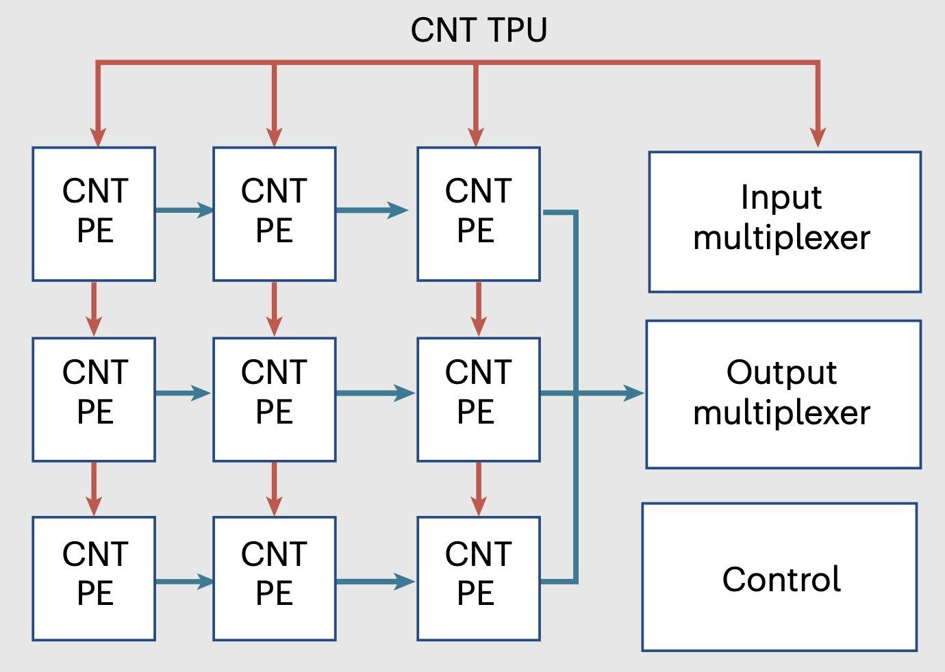 北京大學團隊在這一領域取得了重大突破,開發出了全球首個基於碳納米管晶體管的張量處理單元(TPU)。這款TPU由3000個碳納米管晶體管組成,採用了一種名爲收縮陣列架構的設計,可以像流水線一樣同步處理多個計算任務,大幅提升了計算速度和效率。