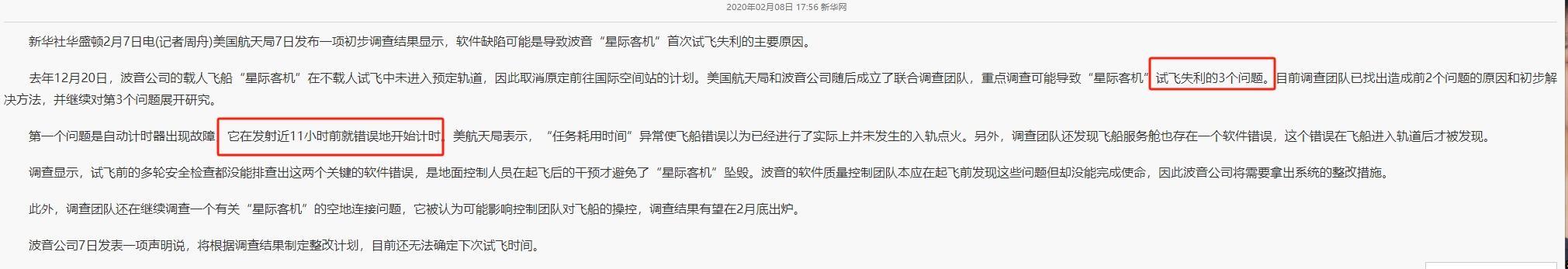 2019年12月,波音飛船第一次無人軌道試飛,原本計劃和空間站對接,結果呢,飛船鐘表和地面時間相差了11個小時,由於飛船計時器錯誤,飛船就覺得自己偏離了軌道,於是姿控發動機持續點火修正軌道,這個過程消耗了太多的推進劑,導致飛船沒法對接空間站,只能返回地面。