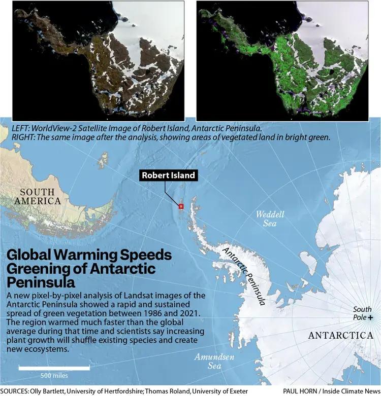10 月 4 日,一篇發表在《自然·地球科學》期刊的文章揭示了南極半島的新變化,原本被認爲是乾燥寒冷的不毛之地的南極洲,其邊緣在過去的四十年裏顯著綠化。科學家利用衛星數據發現,南極半島的植被覆蓋面積從 1986 年的 213 英畝增長到 2021 年的 2,952 英畝,並且綠化速度更是隨着時間的推移而加快。