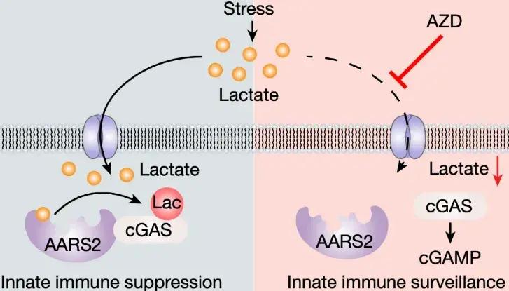 通常在劇烈運動之後,人體的乳酸水平會隨之升高。而研究團隊發現,當乳酸水平升高時,細胞內的丙氨酰 -tRNA 合成酶 1 和 2(AARS1/2)能夠感知乳酸的存在,並利用乳酸對 cGAS 進行乳酸化修飾,導致 cGAS 失活——而 cGAS 是參與抗病毒先天性免疫反應的關鍵蛋白,其活性的抑制意味着機體對病毒的防禦能力下降。也即是說,乳酸的積累很可能會削弱機體的抗病毒免疫反應。