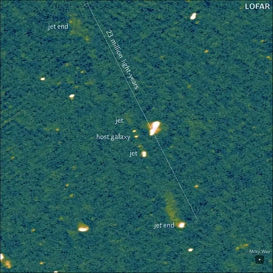LOFAR射電望遠鏡拍攝的已知最長的黑洞噴流對, 被命名爲“波爾費裏翁”