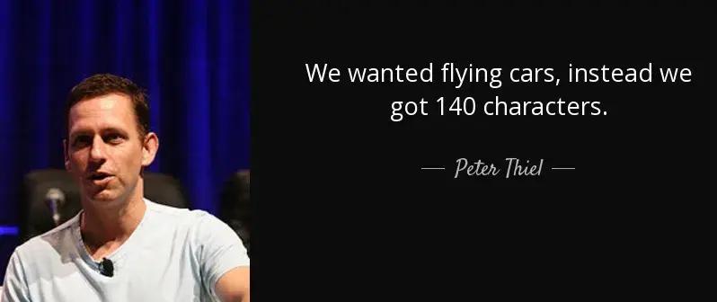 硅谷創業教父彼得·蒂爾因爲互聯網浪潮而成功,但是在 10 年前,他卻用這樣一句話表達過自己對當時科技發展的失望:“我們本來可以得到一款可以飛的汽車,結果得到的卻是 140 個字符”。