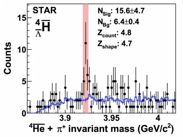 反氦-4 與 π+介子不變質量譜中的反超氫-4 信號(圖源:中國科學院近代物理研究所)