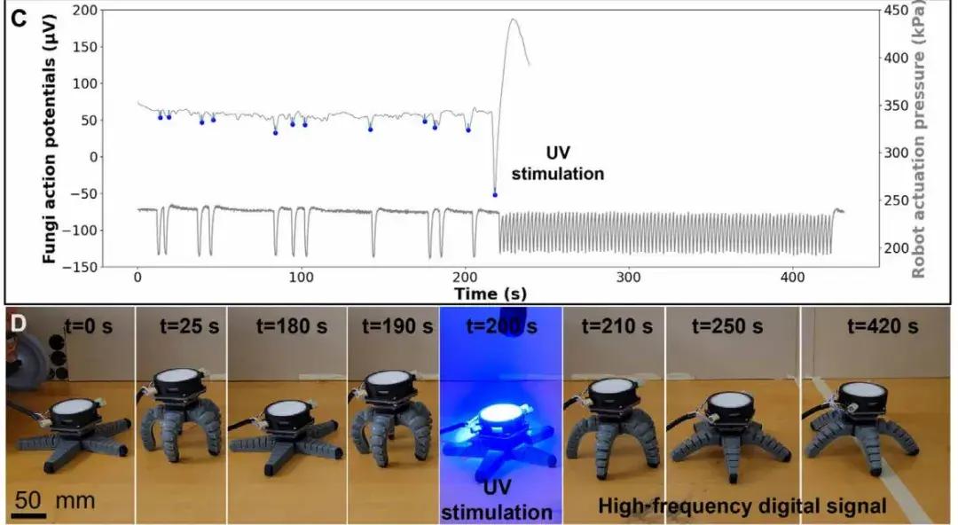 這項研究已經可以做到,在菌絲體受到光照之後進行響應,也就是說機器人可以根據菌絲體產生的電脈衝進行行走和滾動。當然,研究人員也表示現在學界還不清楚真菌是如何產生電信號的,所以機器人接收到電信號後,把電信號解讀成“向前移動”,到底是不是真菌的“真實意圖”就不確定了,這個研究只是展示了從菌絲體中讀取信號的可能性。