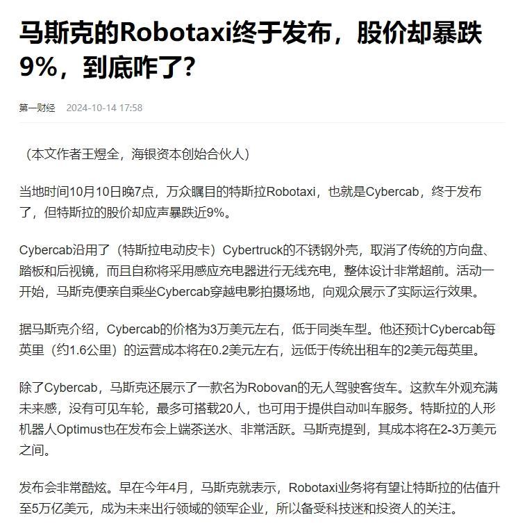 爲啥呢,因爲馬斯克在發佈會上,介紹的這些東西,都是老生常談,沒什麼新意,對資本真正關心的關鍵問題卻避而不談,比如:具體量產時間,多久能盈利,能不能在全球市場落地?