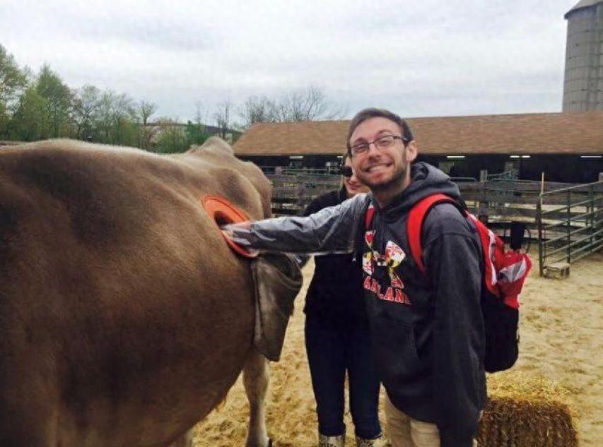 一個男子正笑着把他的手伸進牛腹部的一個大洞裏,而牛身上開了一個大洞,卻沒有什麼反應,任由毫無保護措施的人伸手在它的身體裏攪拌。