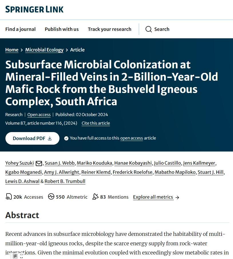 Suzuki, Y., Webb, S.J., Kouduka, M. et al. Subsurface Microbial Colonization at Mineral-Filled Veins in 2-Billion-Year-Old Mafic Rock from the Bushveld Igneous Complex, South Africa. Microb Ecol 87, 116 (2024). https://doi.org/10.1007/s00248-024-02434-8