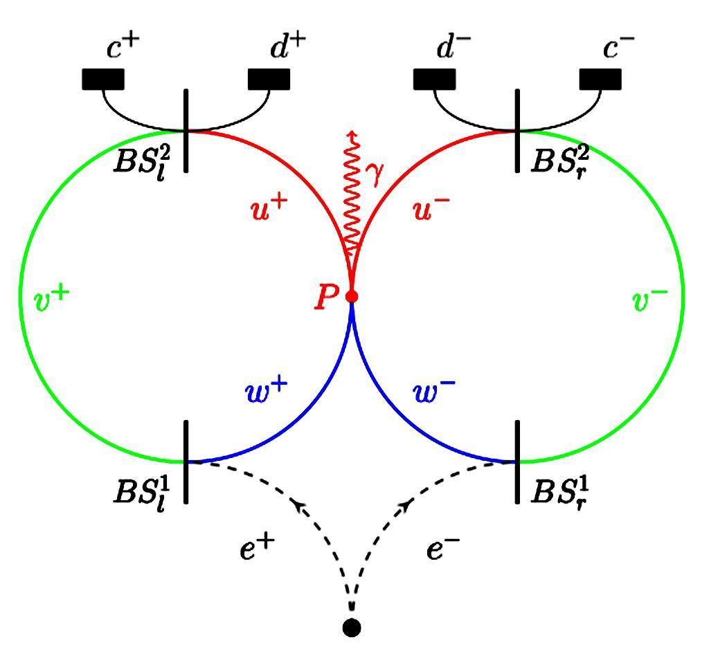 正電子和電子在疊加態下,可以同時走w+、v+和w−、v−路徑,對應於哈代悖論中的四個事件: