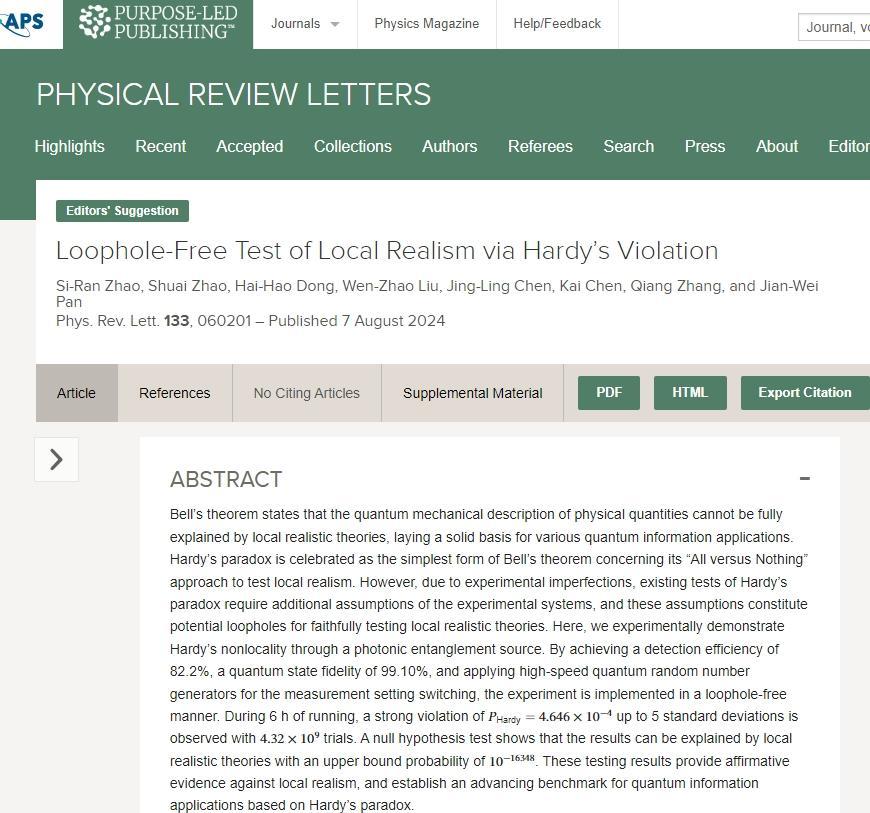 “Loophole-Free Test of Local Realism via Hardy’s Violation” by Si-Ran Zhao, Shuai Zhao, Hai-Hao Dong, Wen-Zhao Liu, Jing-Ling Chen, Kai Chen, Qiang Zhang and Jian-Wei Pan, 7 August 2024, Physical Review Letters. DOI: 10.1103/PhysRevLett.133.060201