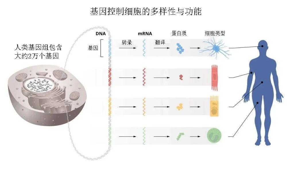 基因調控能讓每個細胞從DNA中精心選擇其中的某一些基因來進行表達,從而產生特定的mRNA,再把這些mRNA翻譯成蛋白質,來完成特定的生物學功能。這確保了只有正確的一組基因在每個細胞類型中活躍,這就是細胞分工的基礎。