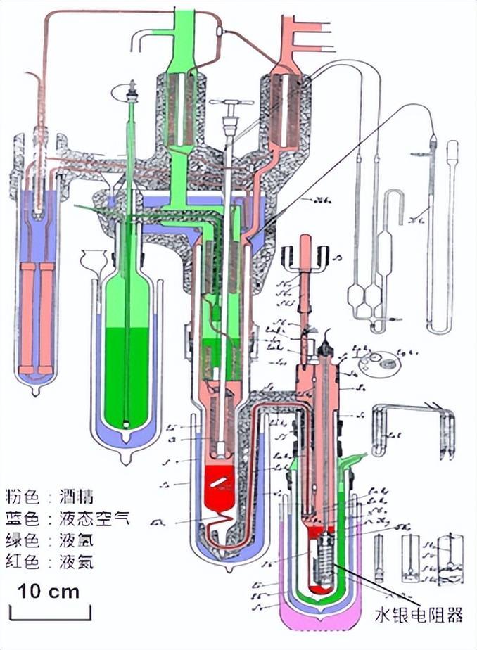 首次發現超導現象的玻璃液氦恆溫器(毛細管內徑50um)。外部容器注入酒精,是爲防止水蒸氣在玻璃上凝結影響觀察;圖中的顏色主要用來區別結構示意,並不是低溫液體真正的顏色