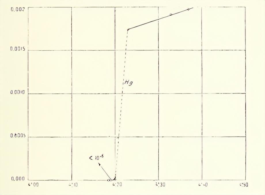 1911年10月26日的實驗數據記錄了汞在溫度低於4.20K時轉變爲超導態 (圖源:1911年第一屆索爾維會議報告)