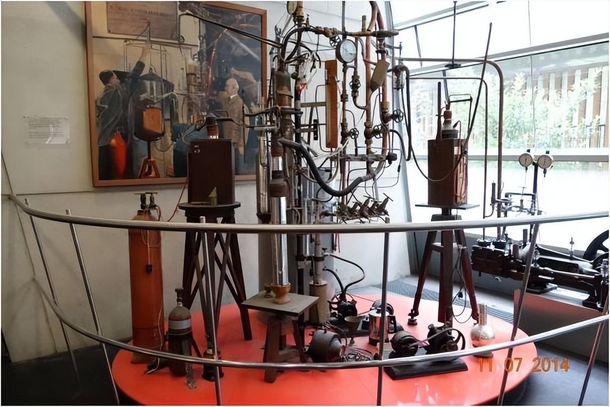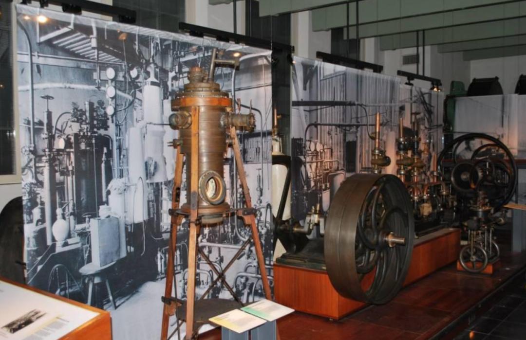 萊頓布爾哈夫博物館陳列的第一臺氦液化器 (右爲凱泰型壓縮機)