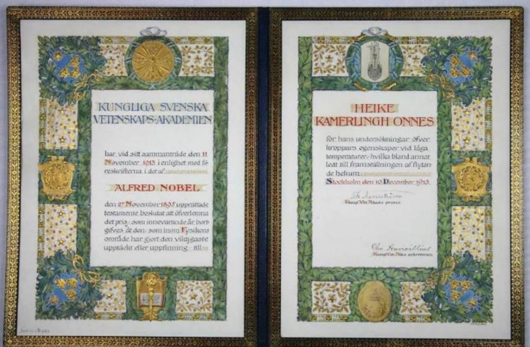 卡末林·昂內斯油畫像和他的諾貝爾獎證書 (圖片來源:萊頓大學和瑞典皇家科學院)