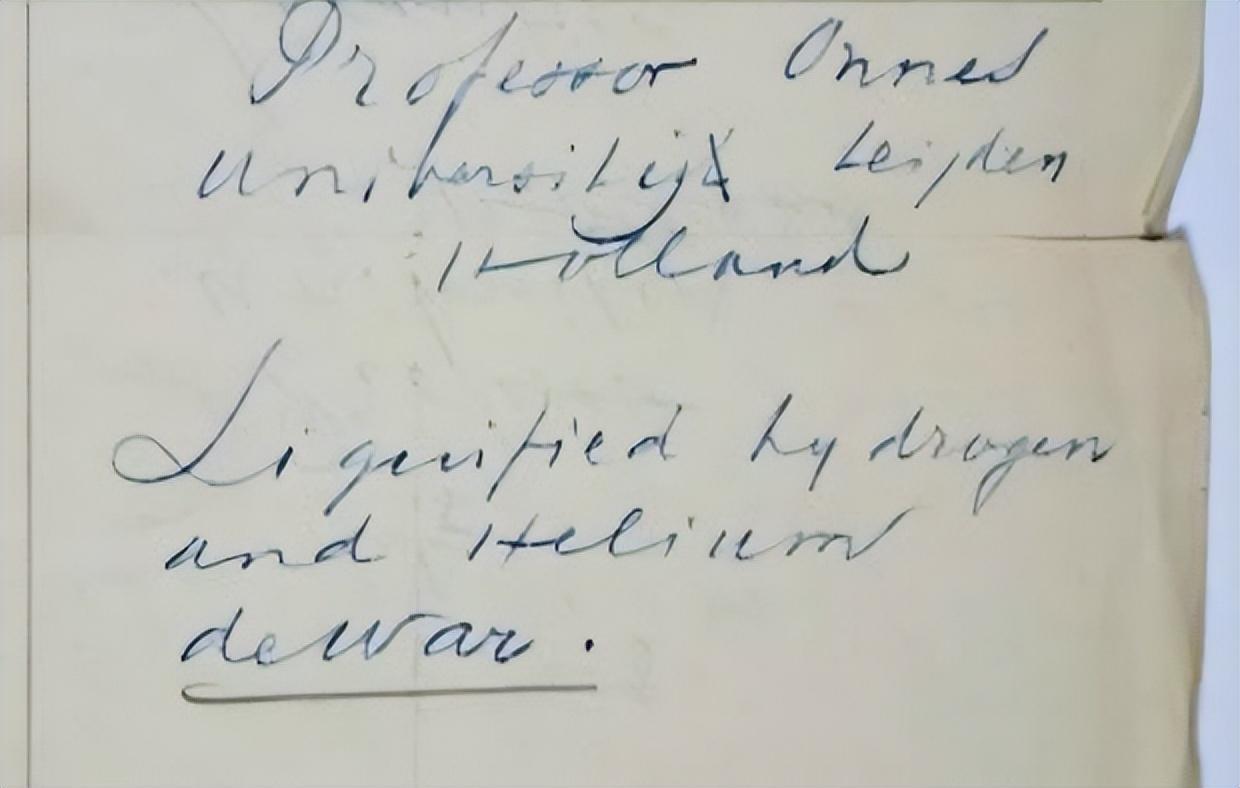 杜瓦實現氫液化後立即發給卡末林·昂內斯的電報 內容爲“液化氫氣和氦氣”