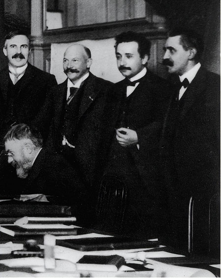 第一屆索爾維會議(局部) 後排從左到右依次爲盧瑟福、卡末林·昂內斯、愛因斯坦、朗之萬