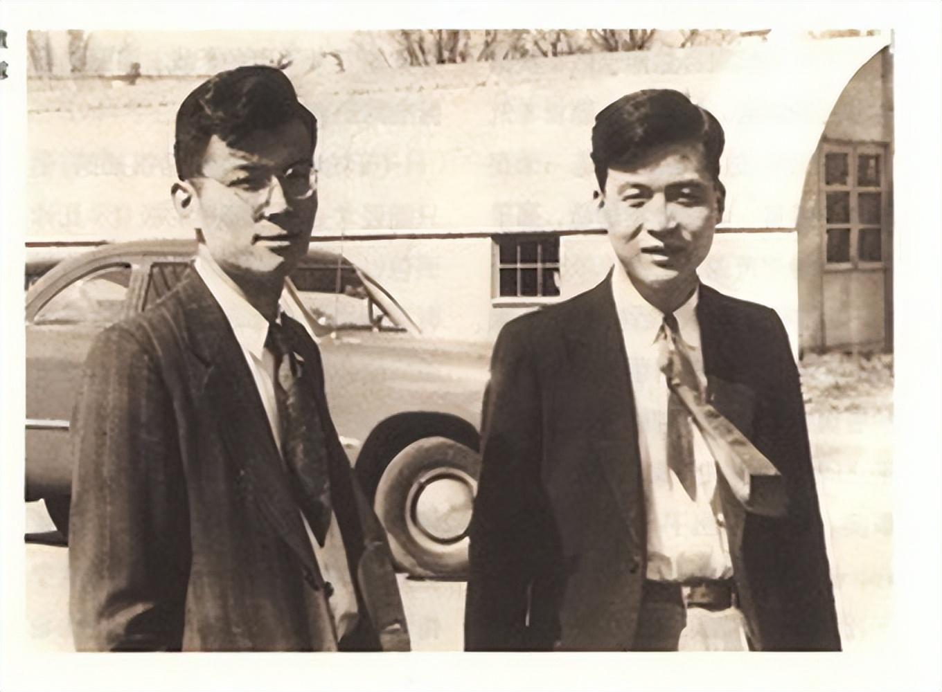 1950年,洪朝生(左)與鄧稼先在普渡大學低溫實驗室簡易房前 (圖片來源:許鹿希《鄧稼先圖片傳略》)