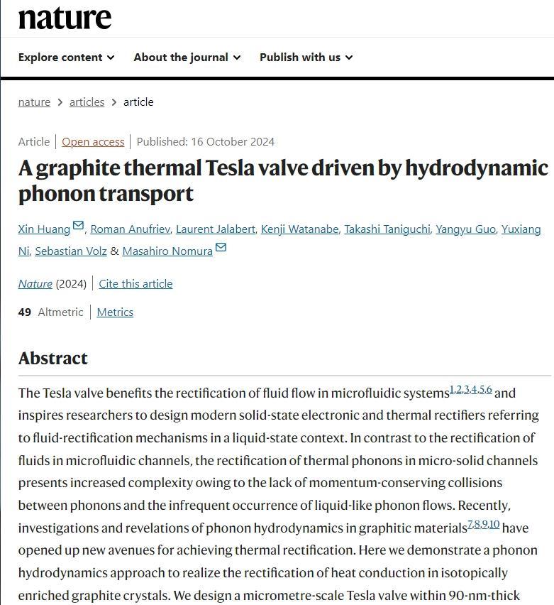 Huang, X., Anufriev, R., Jalabert, L. et al. A graphite thermal Tesla valve driven by hydrodynamic phonon transport . Nature (2024). https://doi.org/10.1038/s41586-024-08052-1