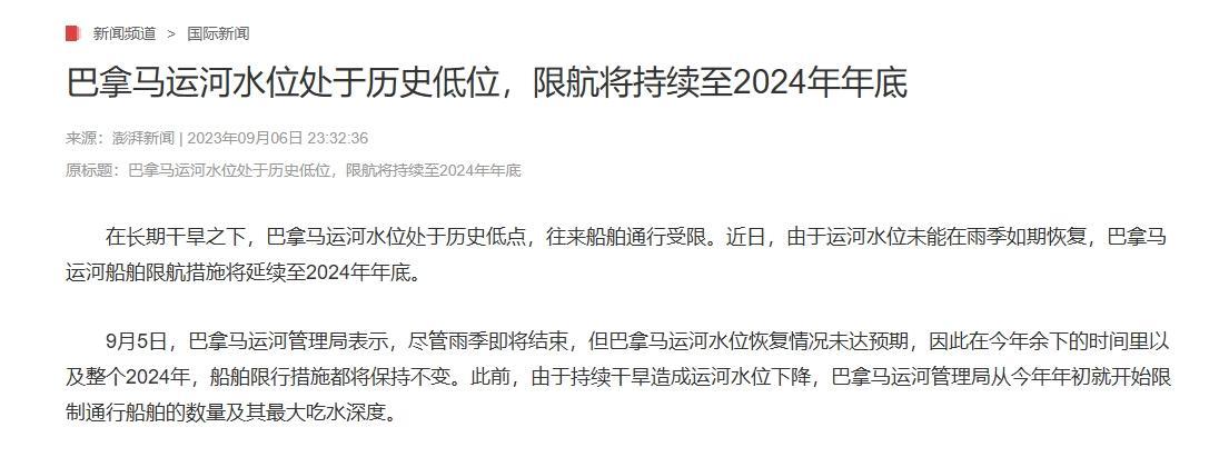 巴拿馬運河承載的貨物運輸佔全球貿易量的5%左右,它的堵船直接影響到了國際貿易,貨運成本上升了,還可能推高國際原材料市場價格,這對我國影響非常大,因爲我國需要從國外進口很多原材料。