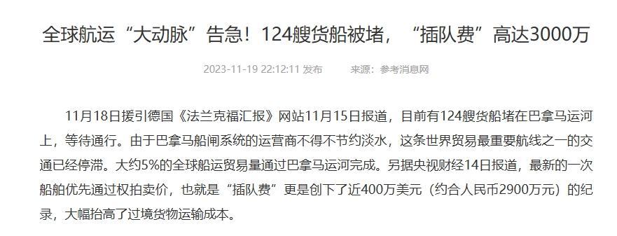 雪上加霜的是,巴拿馬運河這幾年受乾旱影響,時不時的降低通航船隻,一度降低到了每天只通航18艘,其他船要麼等着,要麼交天價插隊費提前通航,2023年日本一艘船就交了插隊費,你猜猜多少錢,2900萬人民幣,搶錢呢!