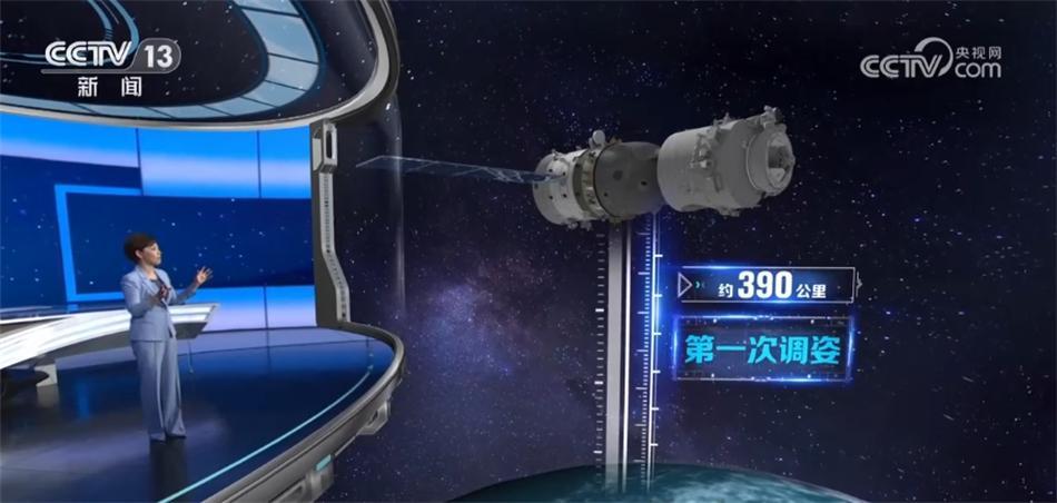 第一次調整姿勢是在距離地面390公里的高度完成,飛船朝着前進方向逆時針轉動90度,這個調姿後軌道艙和飛船分離,這樣脫離後的軌道艙就不會和飛船發生碰撞,保障航天員的生命安全。