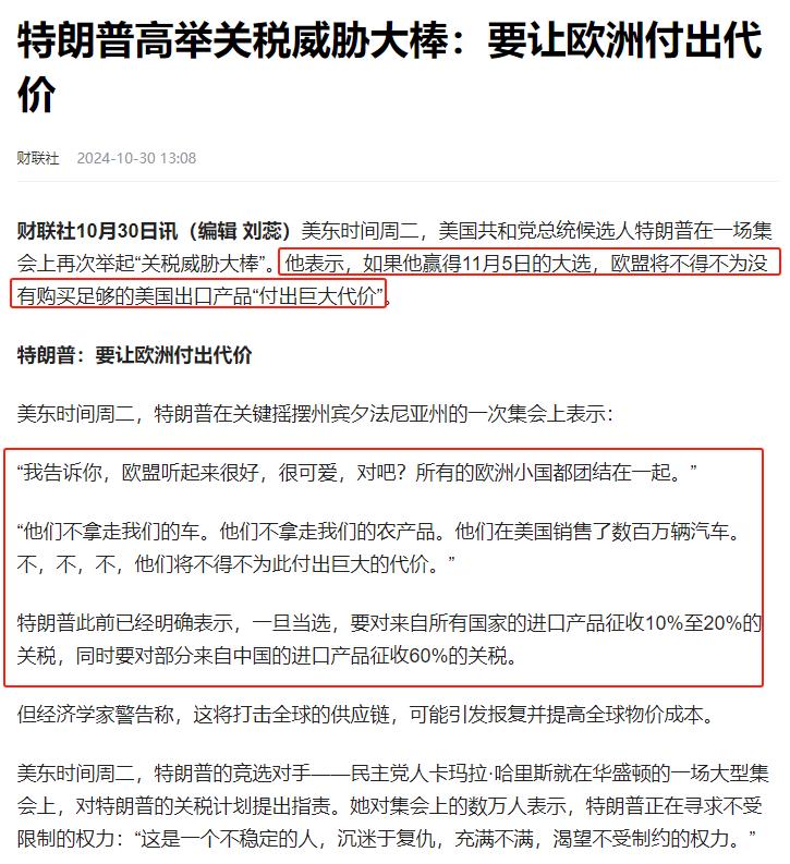 現在民調遙遙領先的川建國同志就公開表示:如果歐洲不多買點美國的東西,就要給歐洲點顏色瞧瞧,上臺後先給他們徵收個10%-20%的稅。